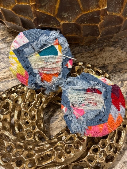 One Size fits all , one of a kind, materials are buttons, safety pin, blue jeans, and Beads.
