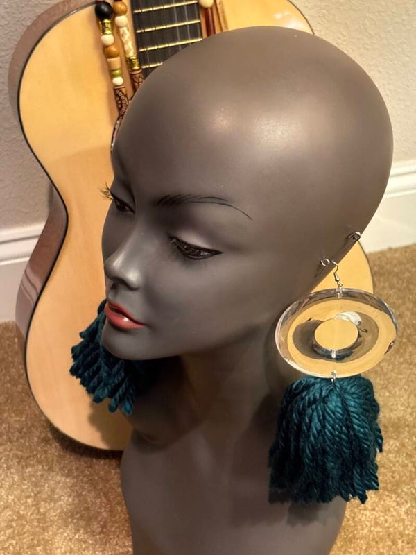 Let's take a Pose in these earrings, hope you are doing a photograph because that's what they are for, 6 inches in length and heavy. Material are Acrylic and very thick Yarn.