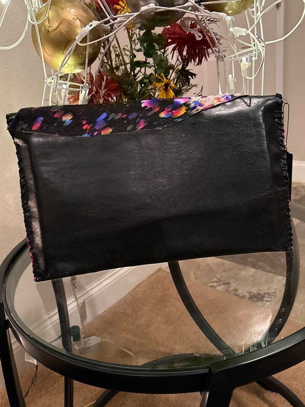 This Clutch is a eye catcher, nice size , real leather and multi colored color cowhide, cloth material on the inside with no snap, one of a kind item.