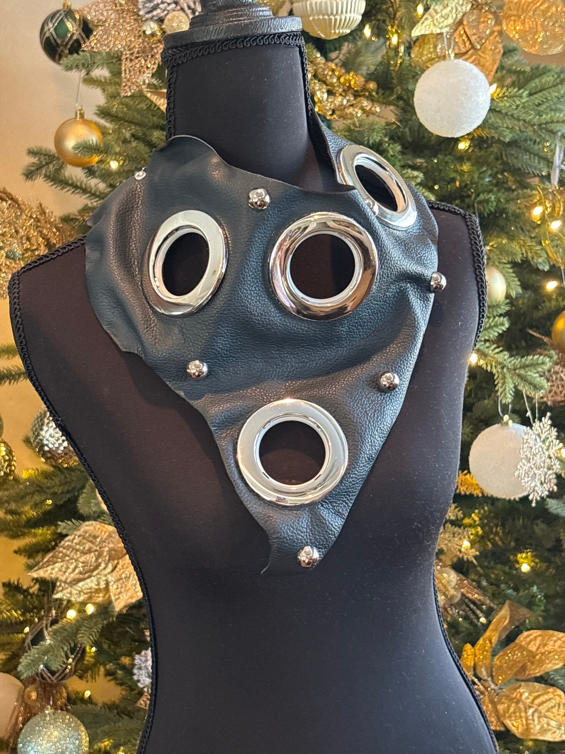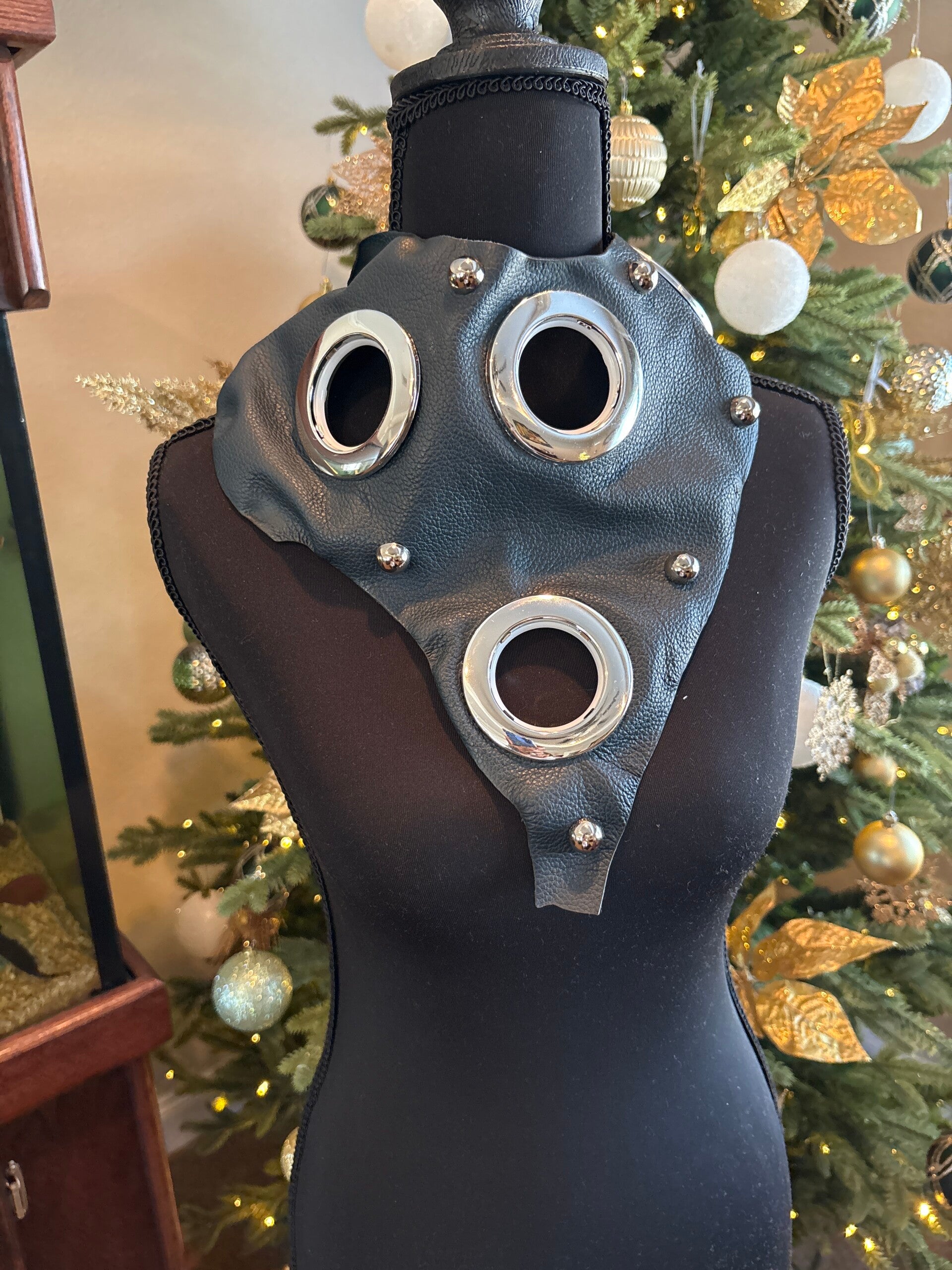 Very Edgy, you can wear it how you want, to the front, side or however you like, one of kind, adjustable chain in the back, real leather, with a special design. Color is silver and a dark earthtone Blue.