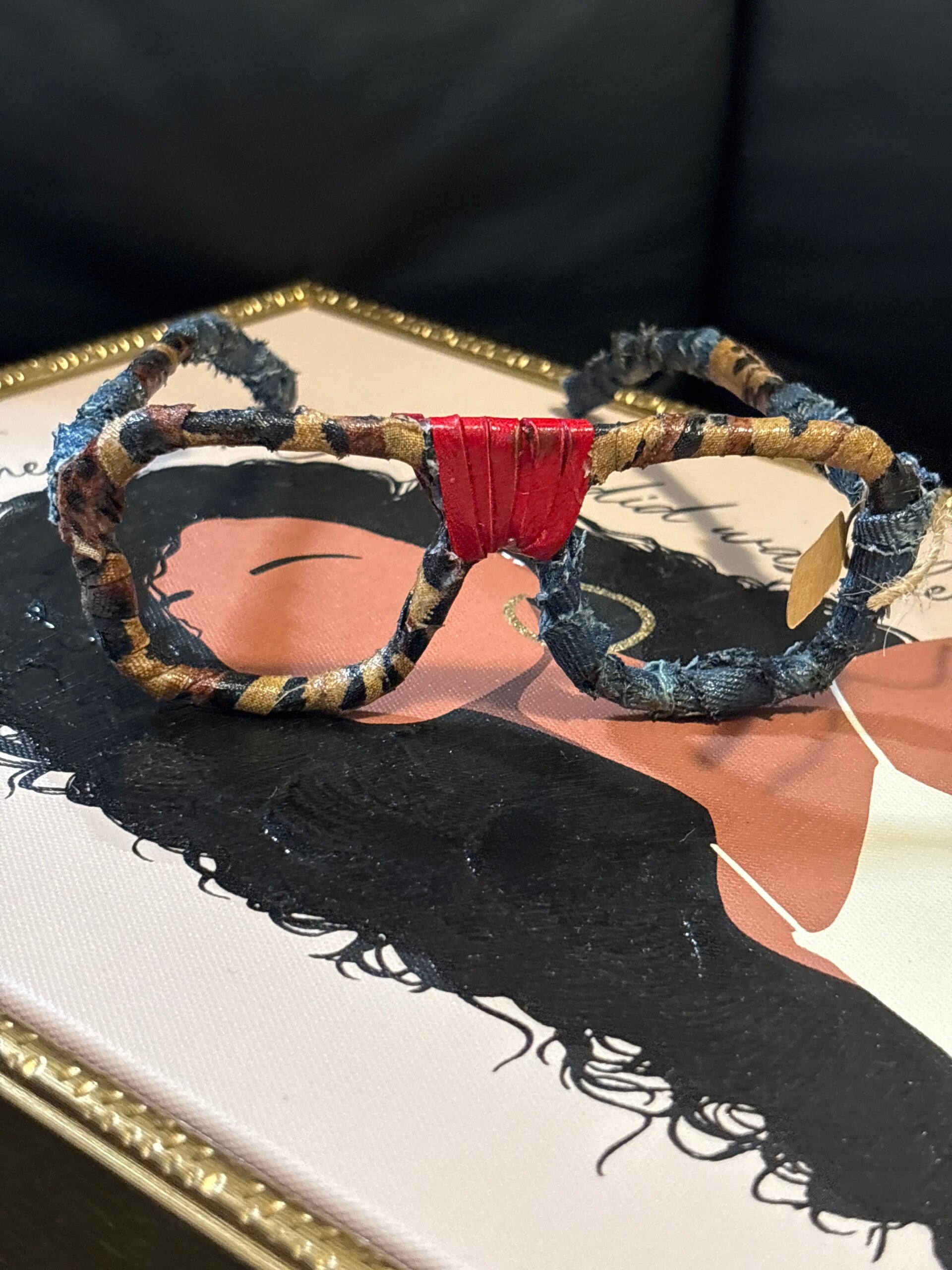 Handcrafted one of a kind , a mixture of red leather, blue jeans and leopard prints fashionable glasses.