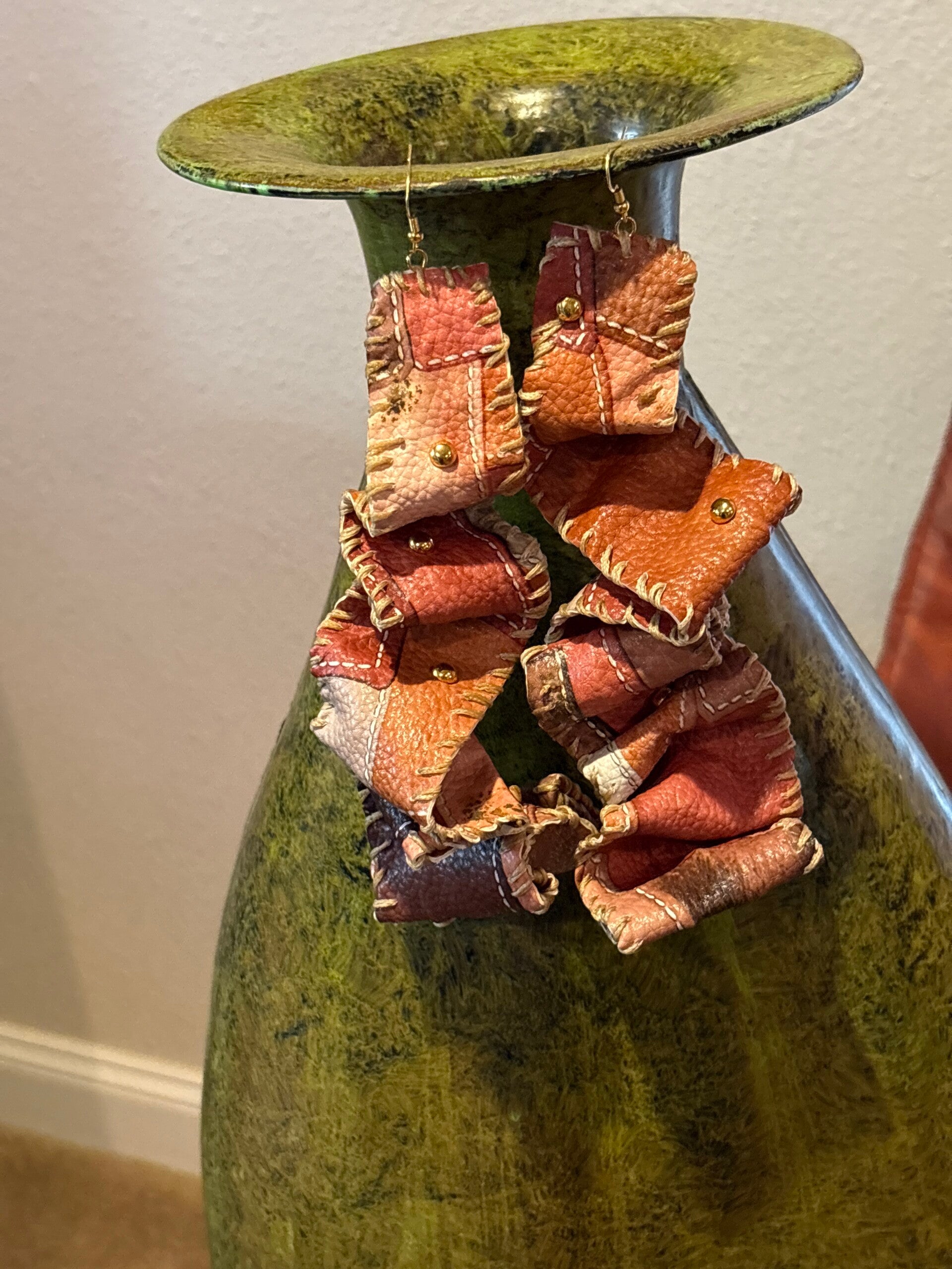 Very unique piece of artwork by hand, one of a kind , materials are real gold sterling silver post, wax threads, gold stubs and faux leather, lightweight to the earlobe, there are about 5" long.