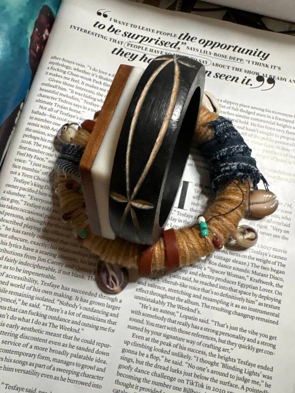 Hobo Fashion , one of a kind... it's up to a size medium in the wrist size.Materials are Twine, wood, beads , blue jeans, leather and yarn.