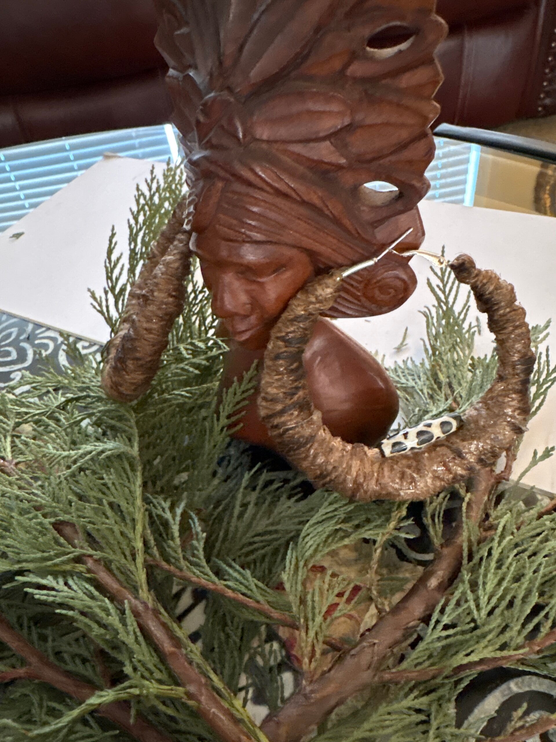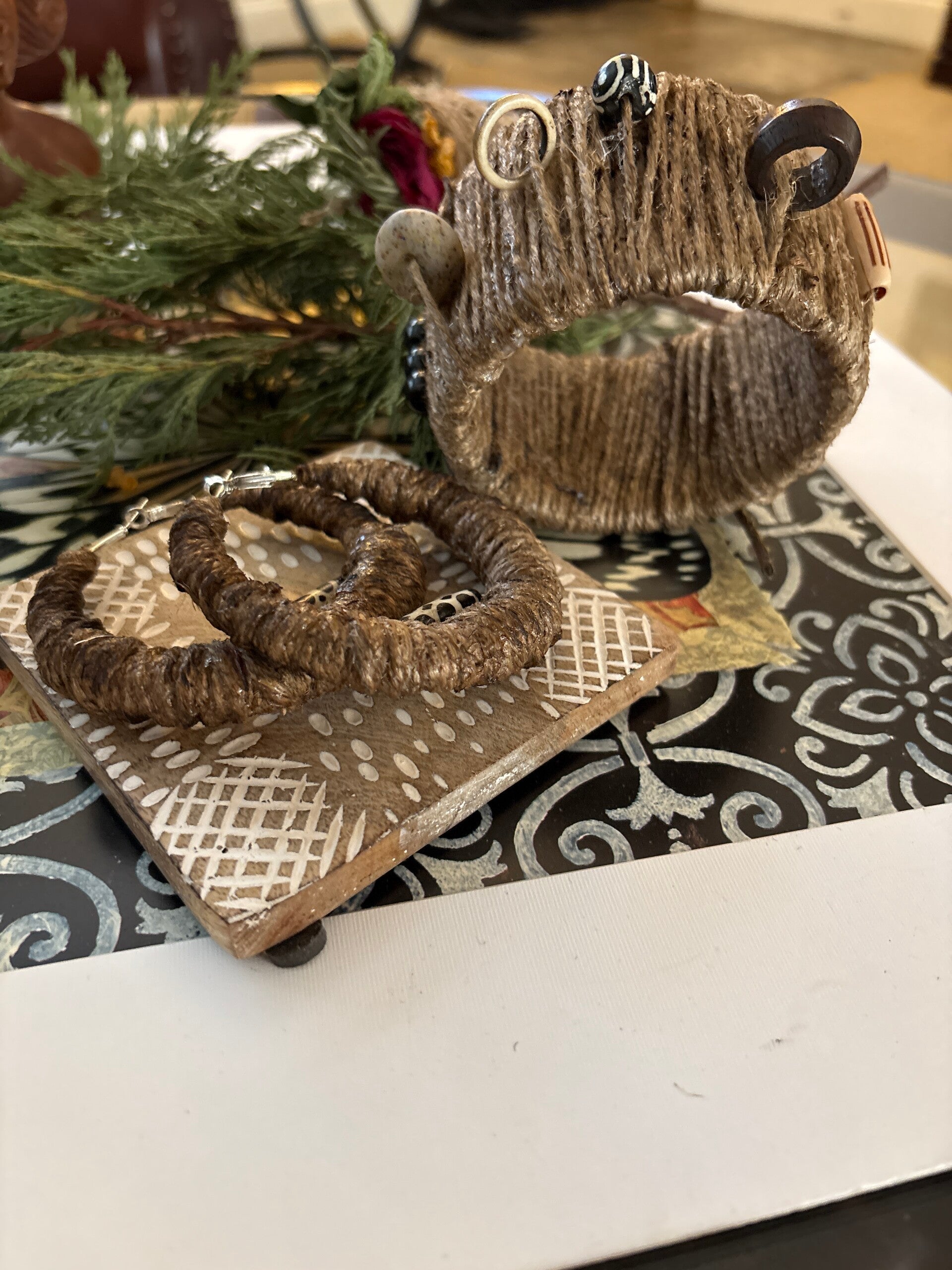 Exotic Stones , Beads and Twine - Handcrafted- uniquely crafted.Fits up to a size medium in wrist and the hoops are lightweight and size small/ medium in size.