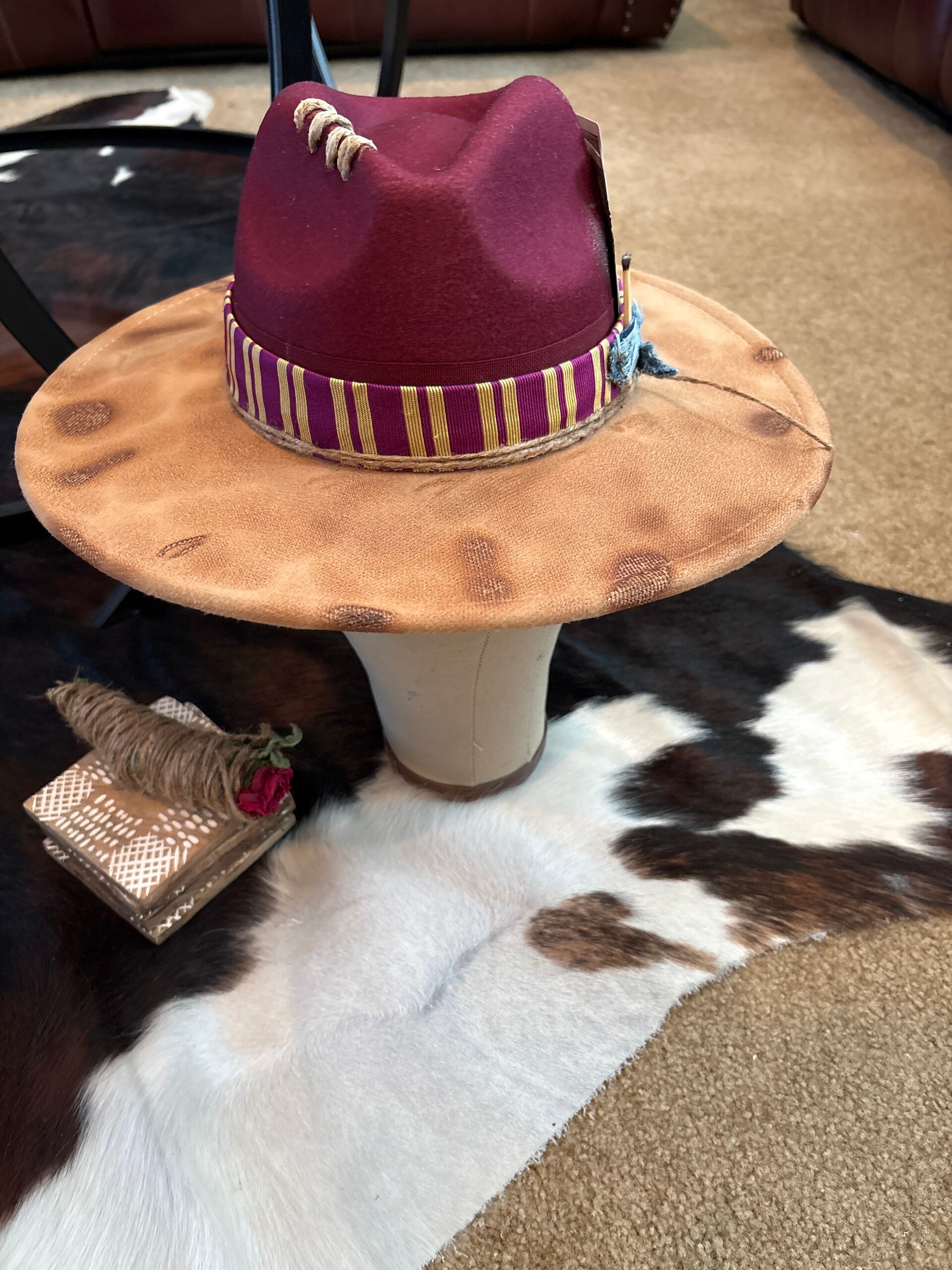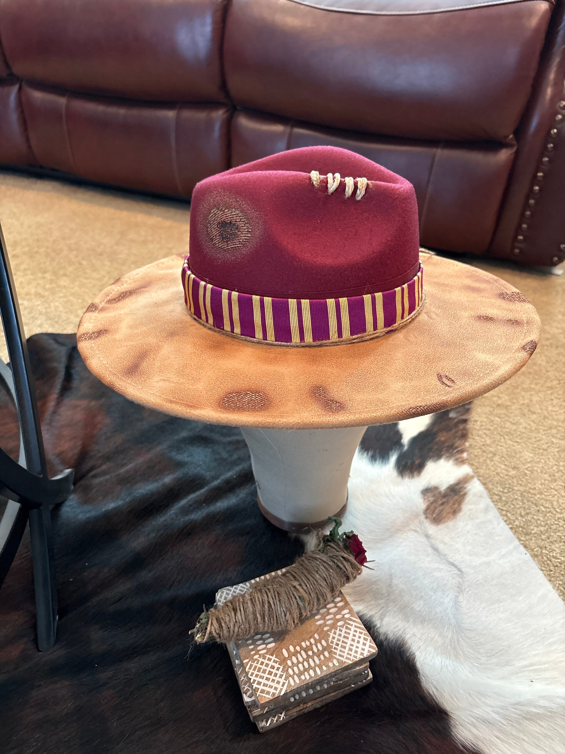 Custom Designed, burned, and distressed hat.Fits up to a size 23 in head measurements. Strings on the inside of hat if you need it to fit securely.