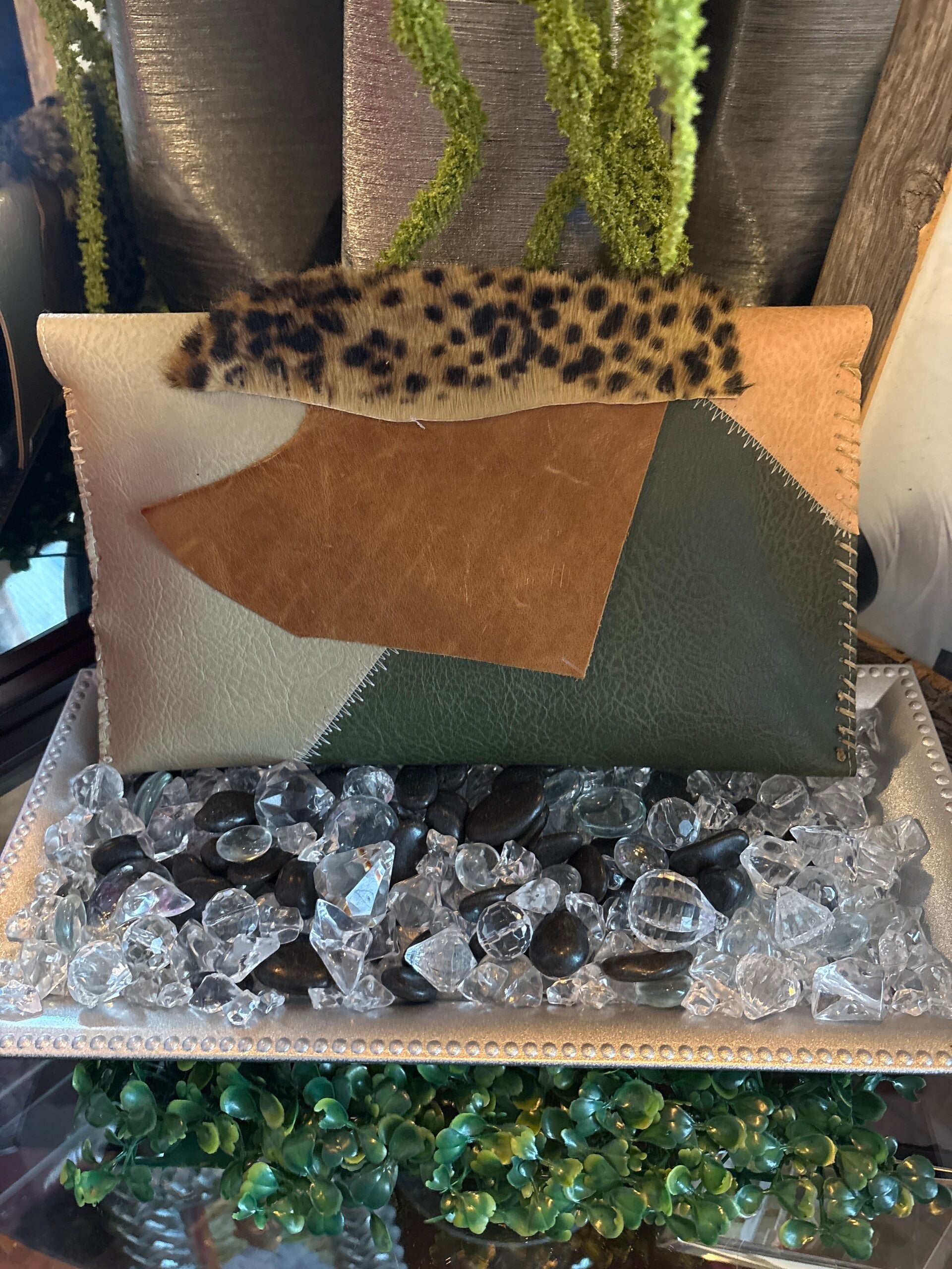 Handcrafted, one of a kind , mixture of faux leather, real leather, real cowhide Tiger fur, a statement piece very simple inside but the outside bring out your outfit.
