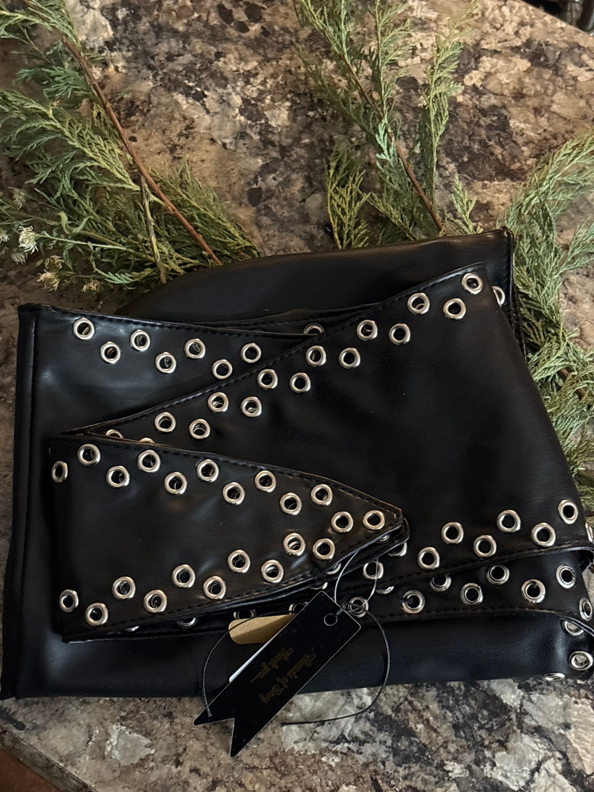 Very Edgy and adorable ,,, it's a faux leather with silver mental around it, wear it however you like and enjoy it.