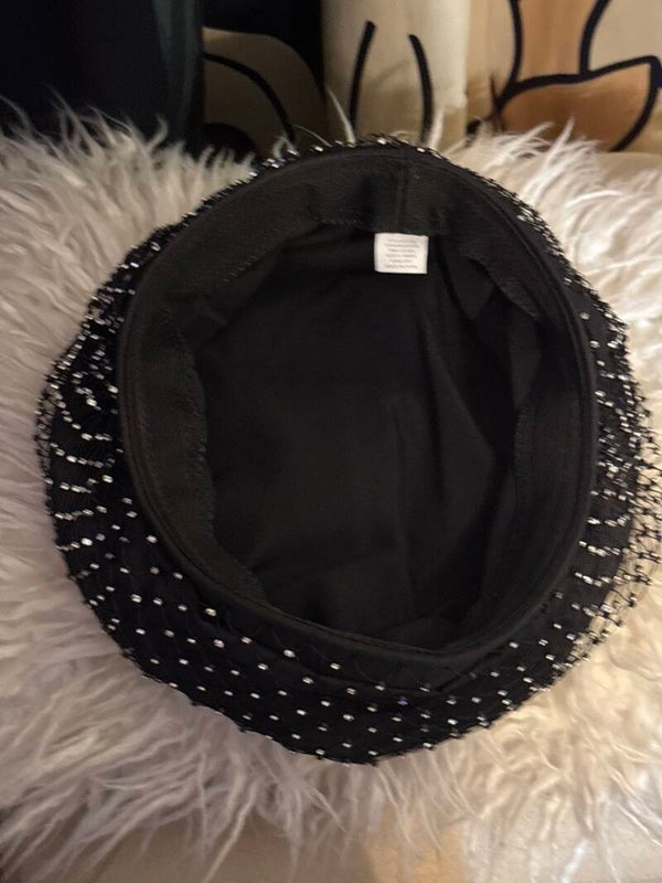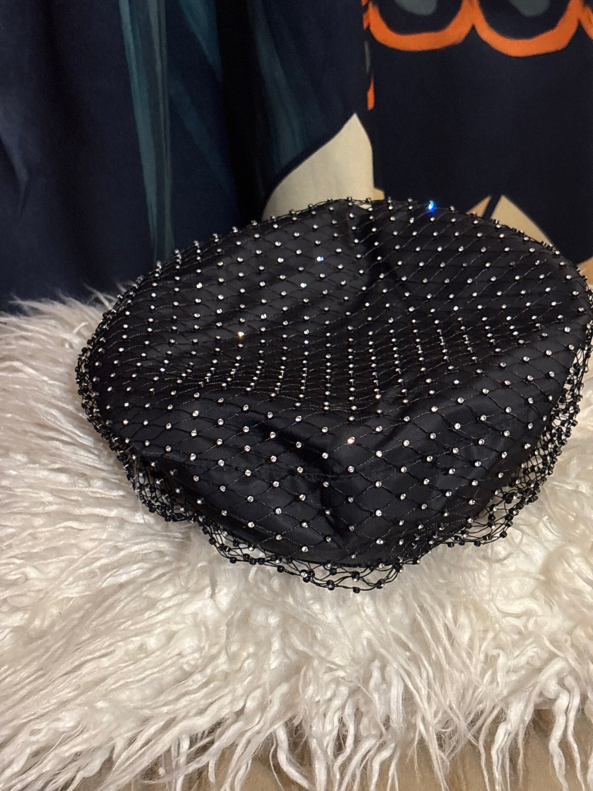 With all the elegance in the world, this is a nice pill box hat with lots of sparkles.