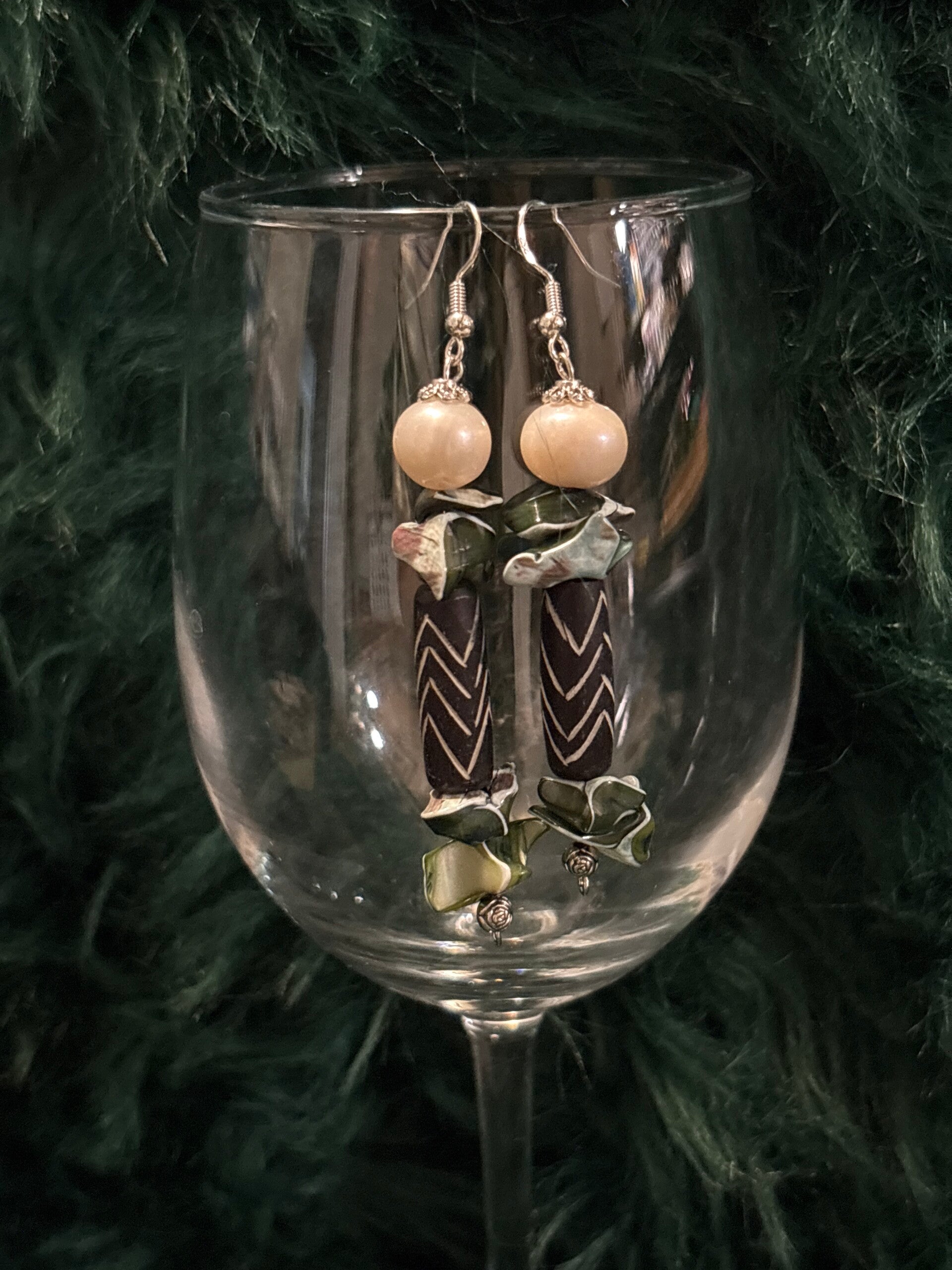 Green Freshwater Pearl & African Batik Bone dangle statement earrings they are 2 1/2 in length and 1"in width,very lightweight and comfortable. Freshwater pearl(real) African batik bone, sterling silver fishhook wearable Art from Threads of Envy