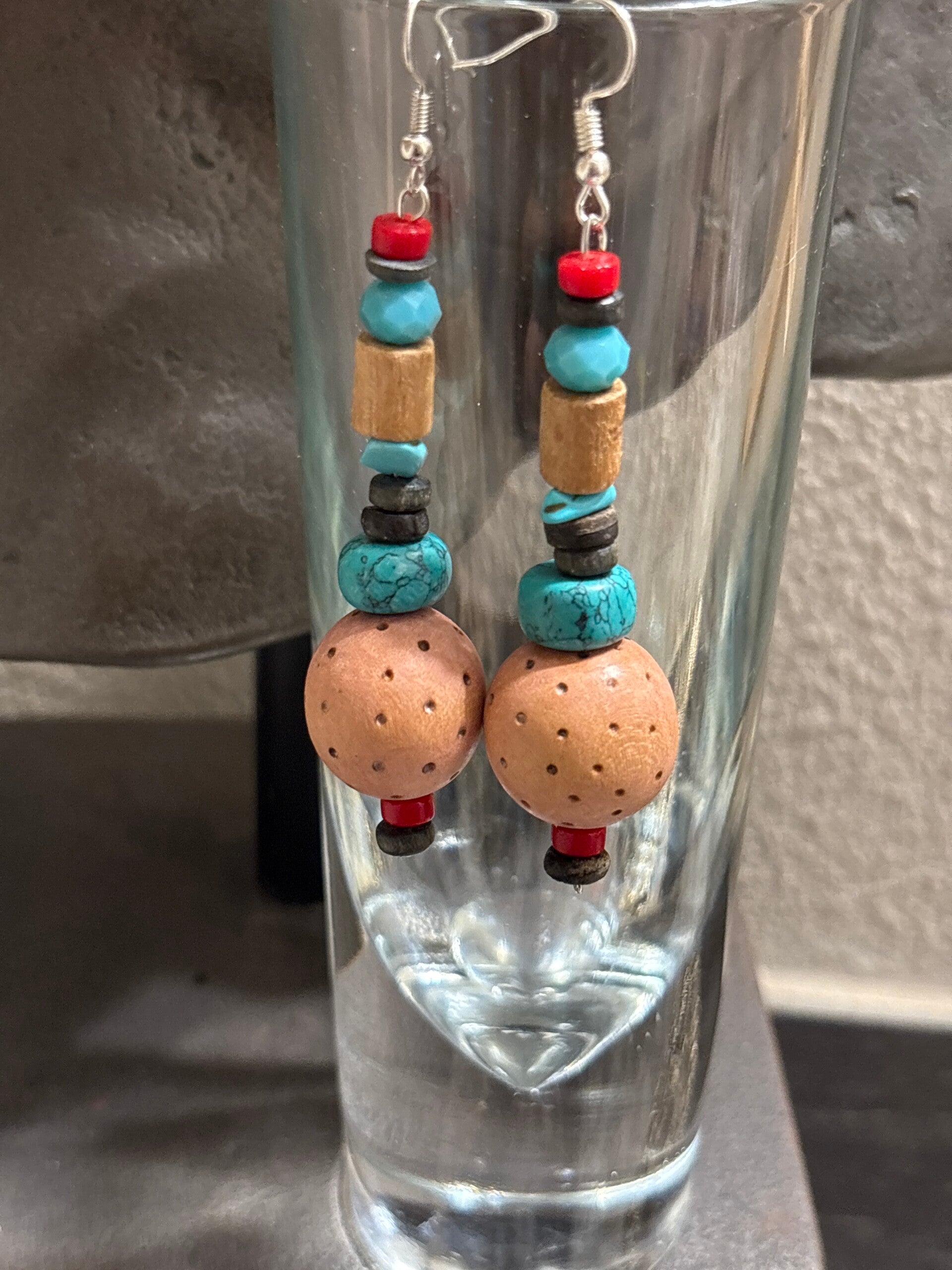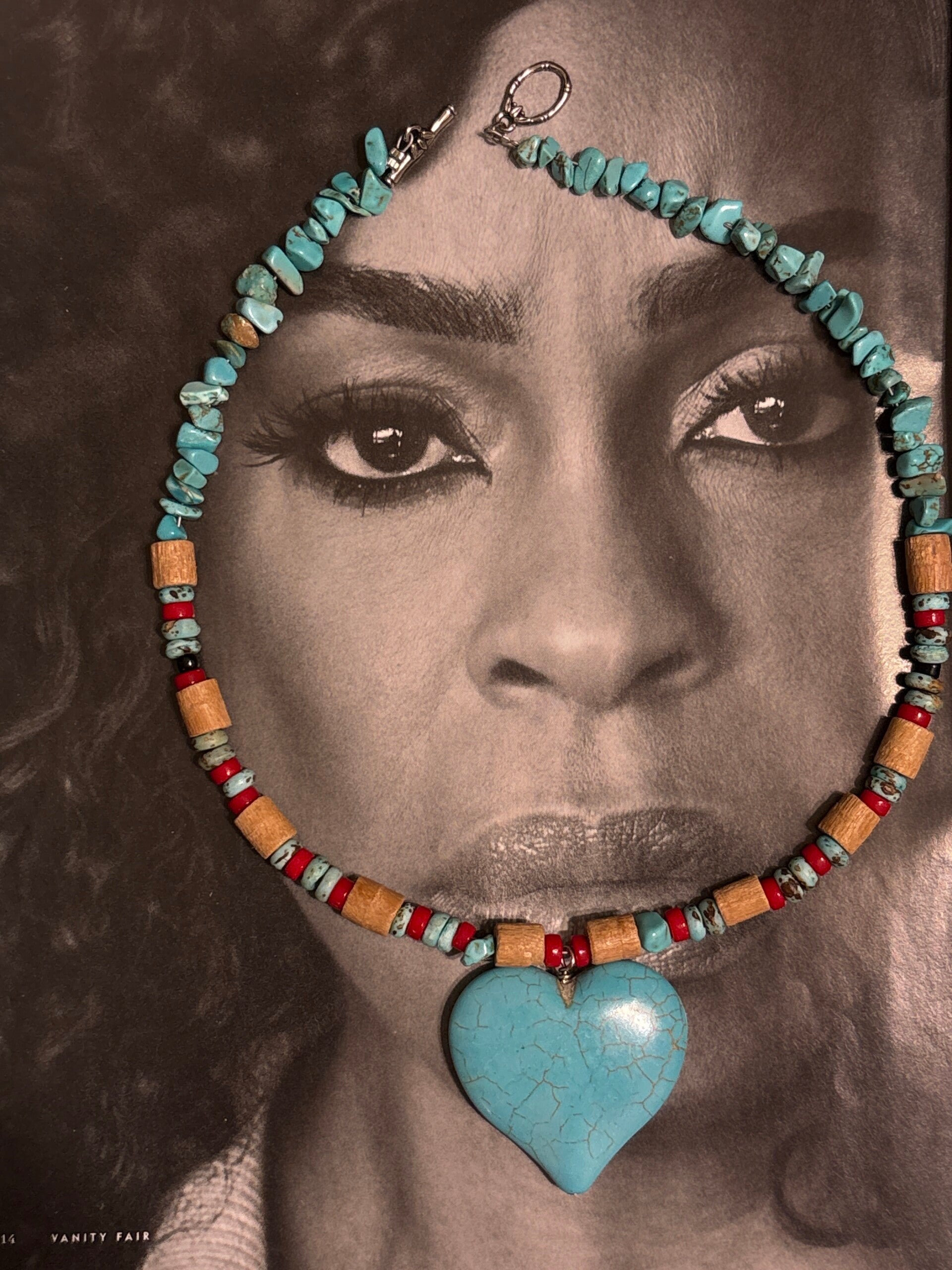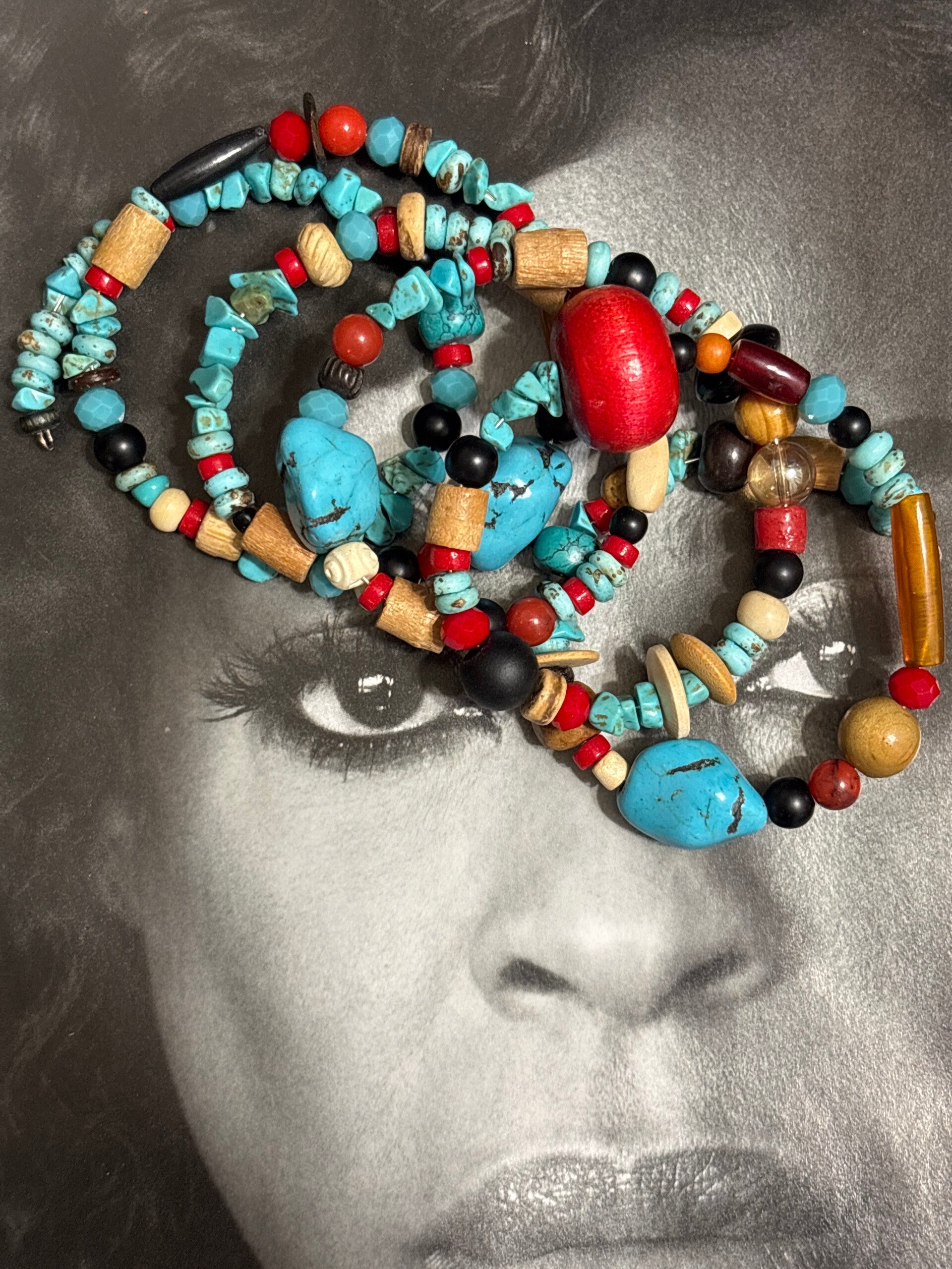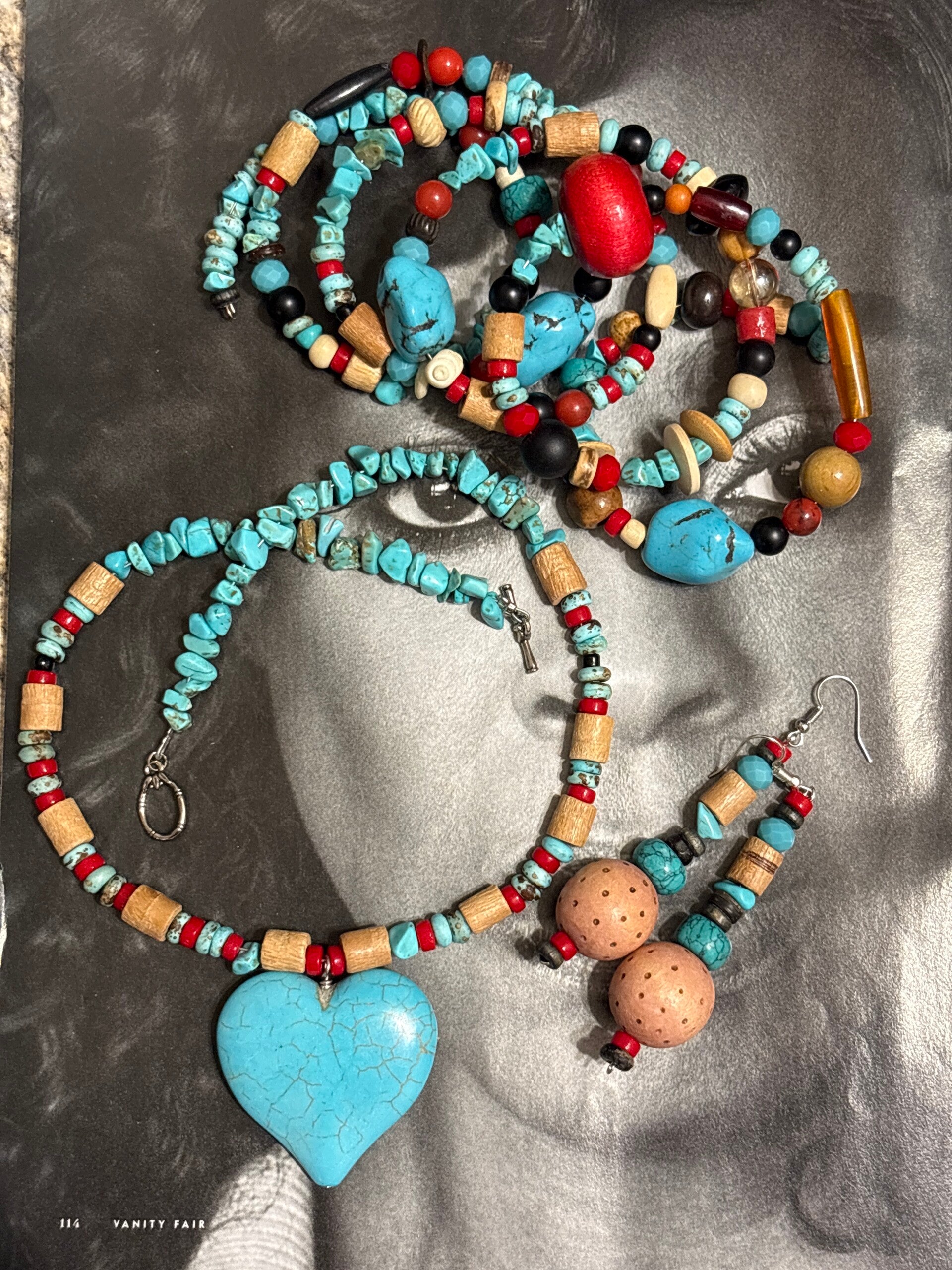 Handcrafted, one of a kind necklace set that is paired with a Bracelet that wraps around your wrist or necklace if you want and earrings that are 4" long which is medium length.