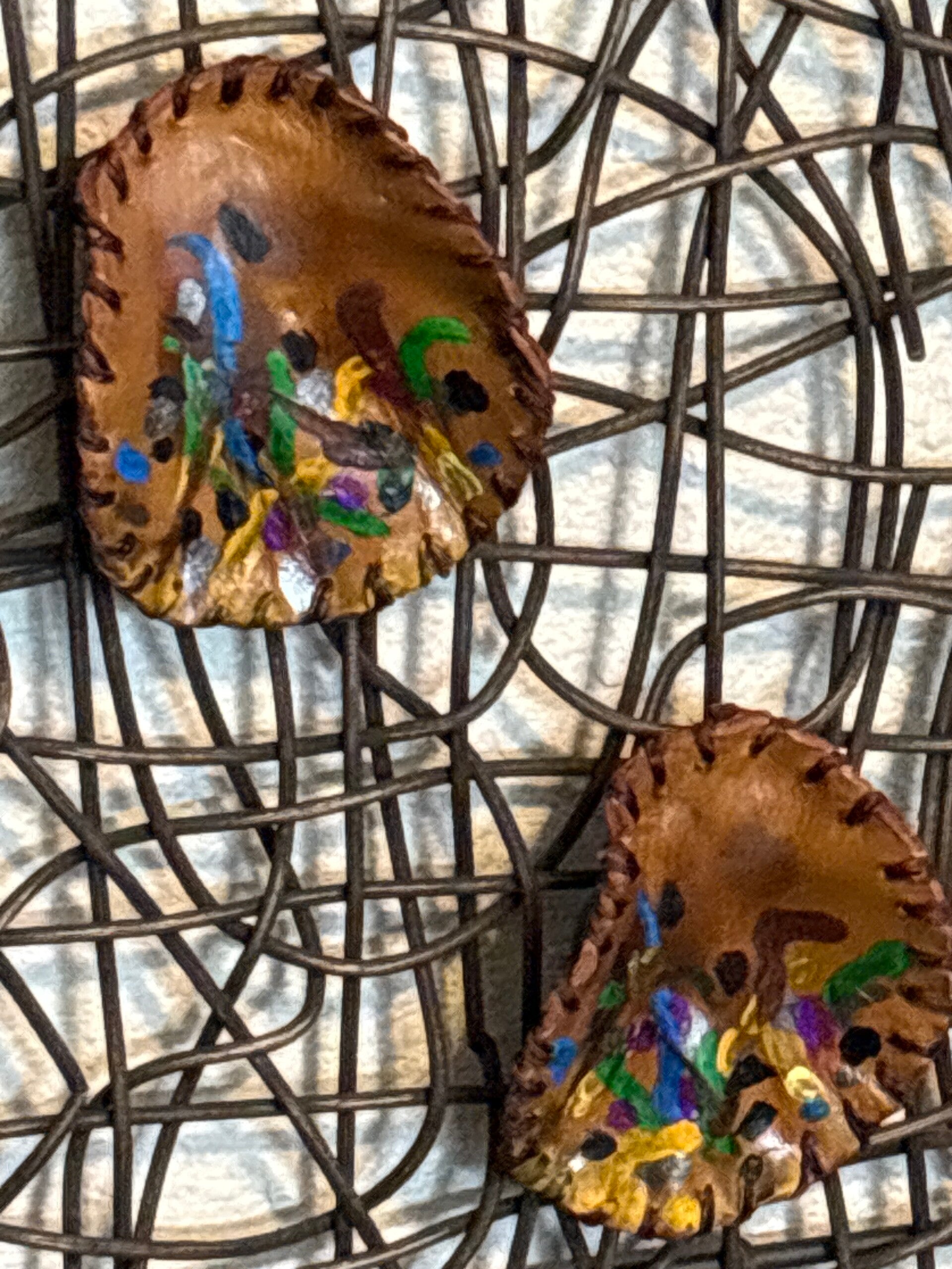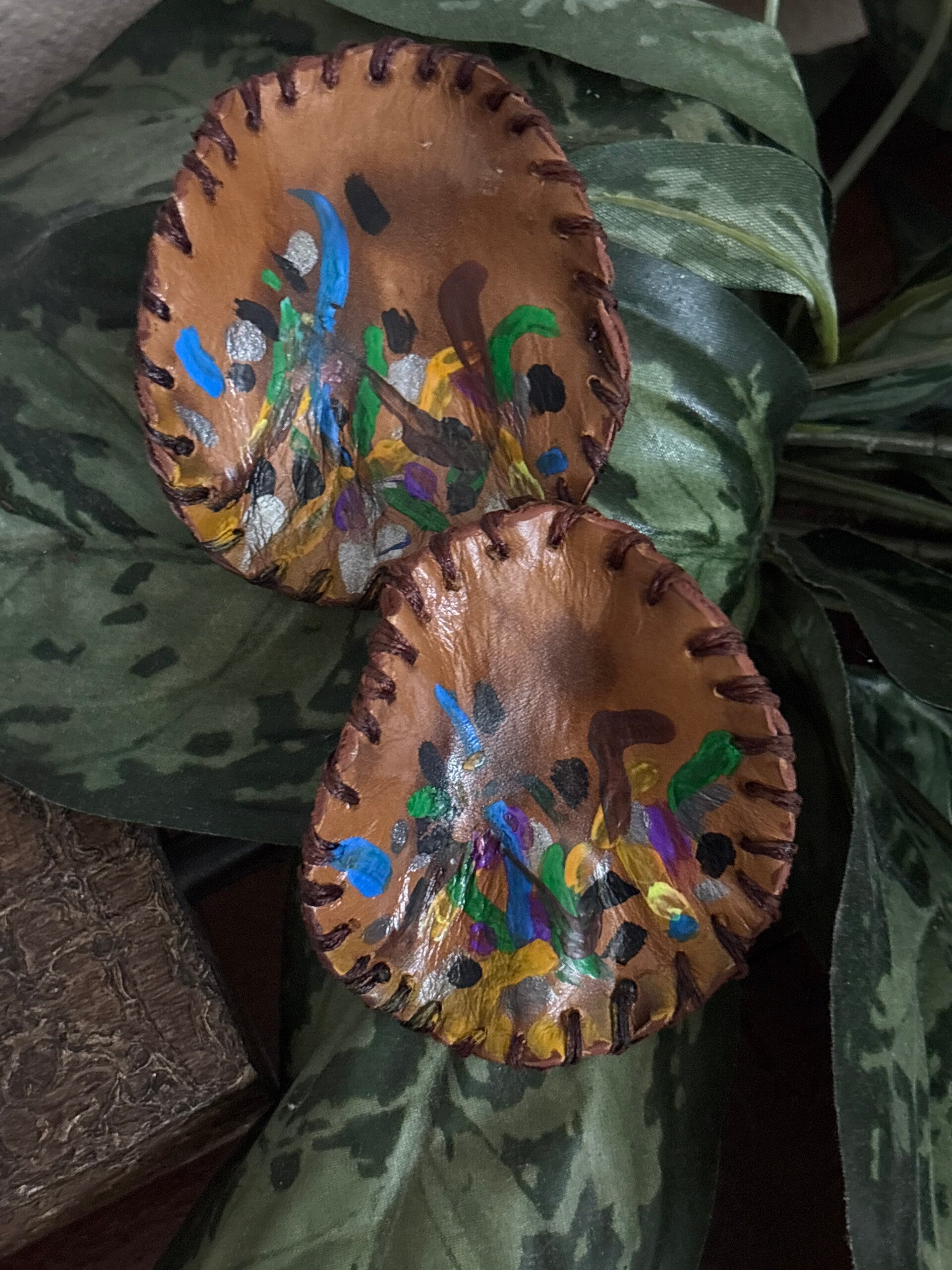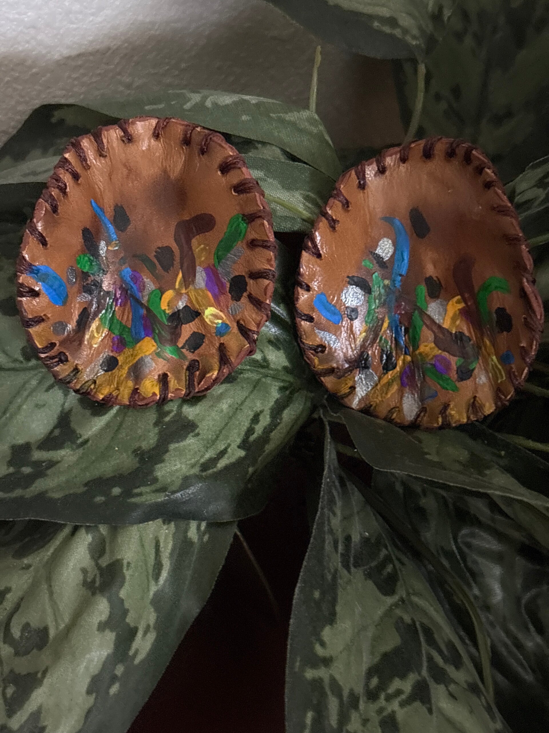 Handcrafted, one of a kind, leather and hand painted ArT, special gold post in the back of the earrings and lightweight.