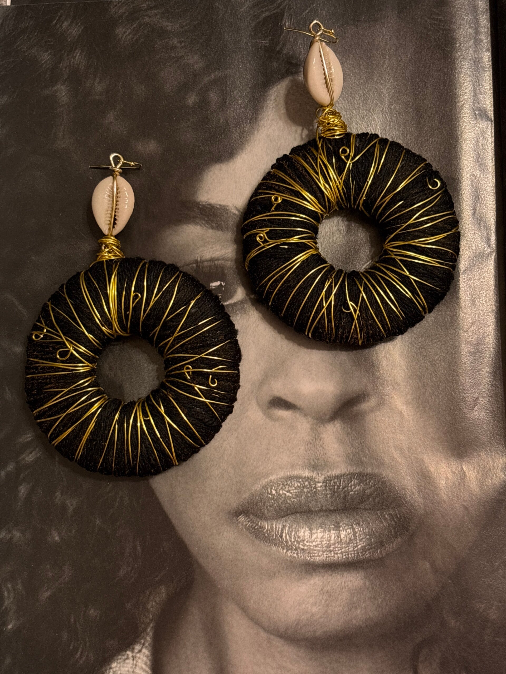 Handcrafted, one of a kind , wire, large vintage Cowie Shell, and other special materials, lightweight. These earrings are long 6".