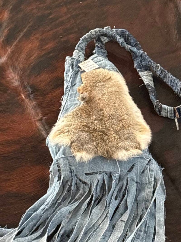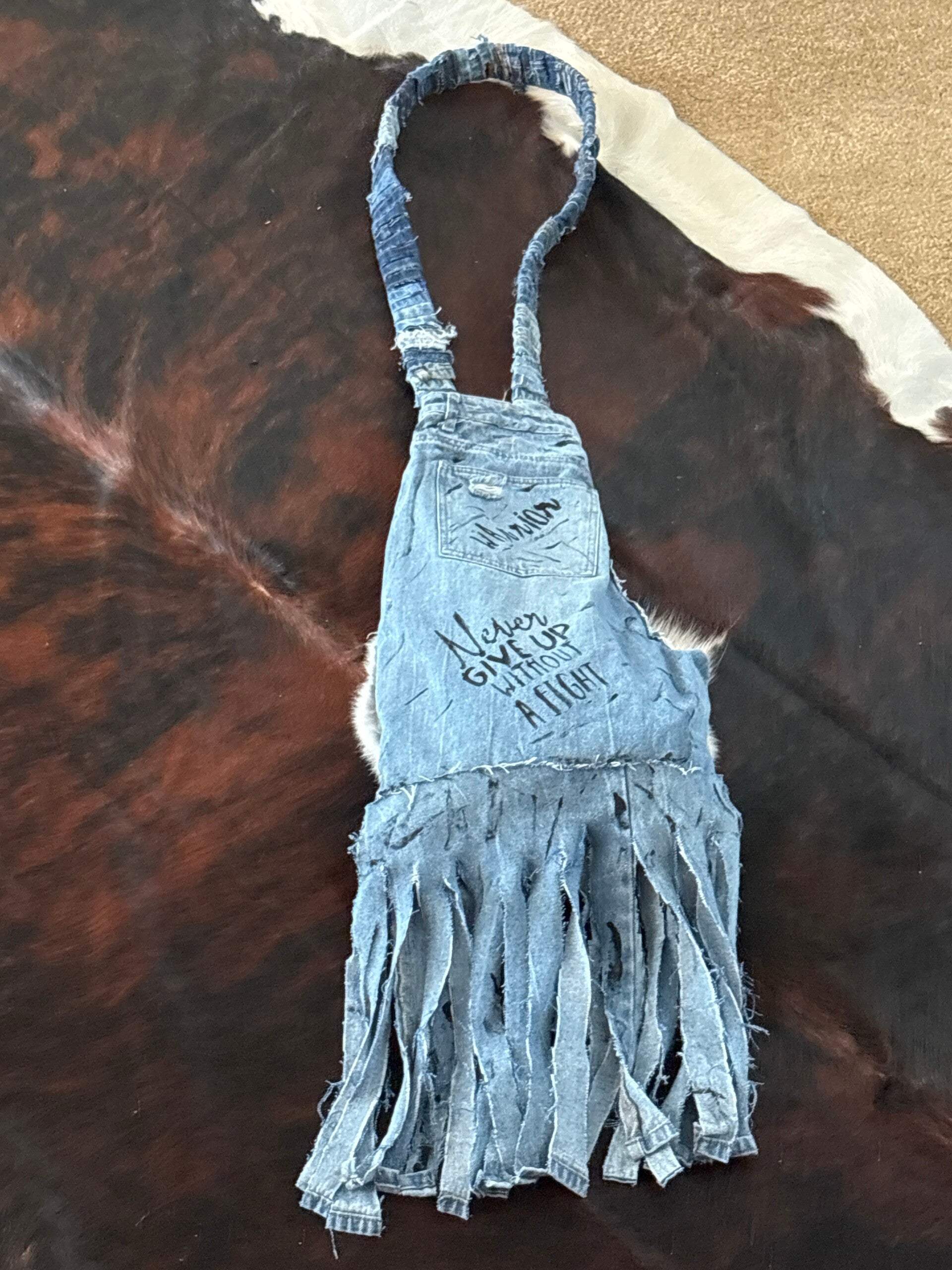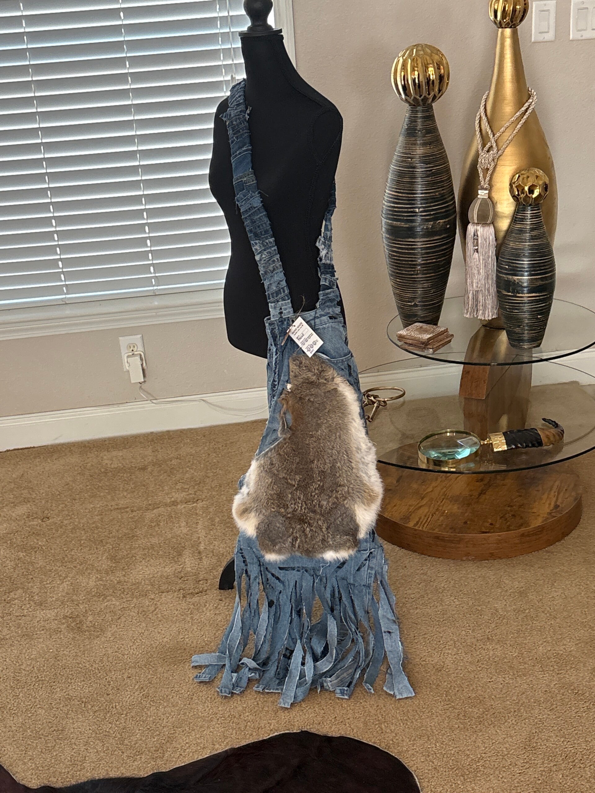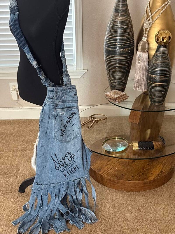 Handcrafted, wear it how you want, it's a statement piece to add to your Urban wardrobe. This strap is long and thick, rabbit fur and blue jeans, a one of a kind statement of ARt. Threads of Envy came up with this beautiful ARt for the Strong women that is suffering from breast cancer and sometimes we just need that word of encouragement that you are a warrior, strong and yes, you can beat this