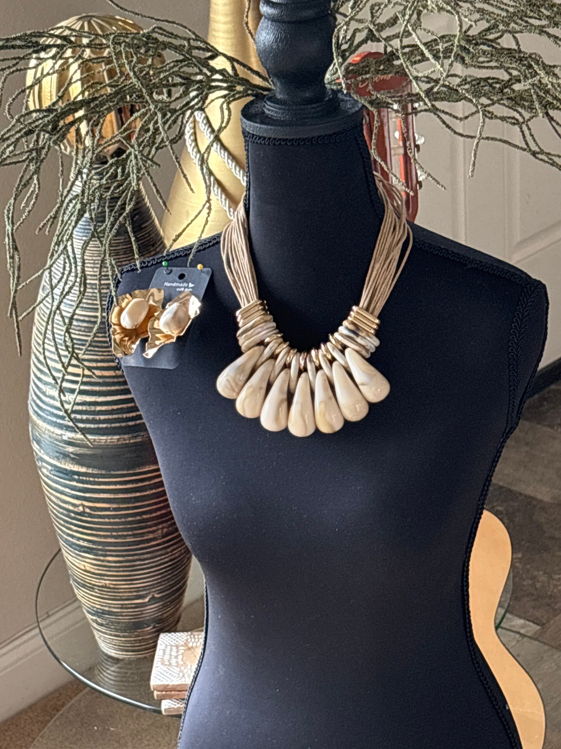 A statement piece, adjustable chain and pierce earrings .