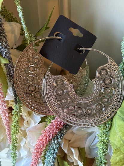 Big and Lightweight, silver in color with a nice enthic print.They are large on Earlobes.